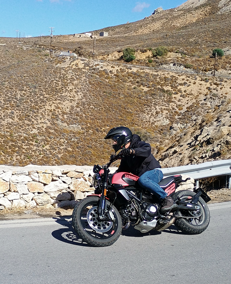 Κάποτε ανάμεσα στις συζητήσεις των παλιών μηχανόβιων υπήρχε η κατηγορία «ιδανική για νησί» και αναφερόταν σε μικρές μοτοσυκλέτες on–off, συνήθως 250 κυβ.εκ. οι οποίες ήταν το μοναδικό μέσο μετακίνησης όλο το χρόνο στην πόλη και τα κατάφερναν περίφημα την εβδομάδα των διακοπών στους στενούς και δύσκολους δρόμους των νησιών, ιδίως του Νότιου Αιγαίου. Αυτή η ανάμνηση σου έρχεται όταν βρεθείς με τη Ducati Scrambler στη Νάξο για μερικές μέρες ξένοιαστης περιήγησης στις παραλίες και τα βουνά του μεγαλύτερου σε έκταση νησιού των Κυκλάδων.