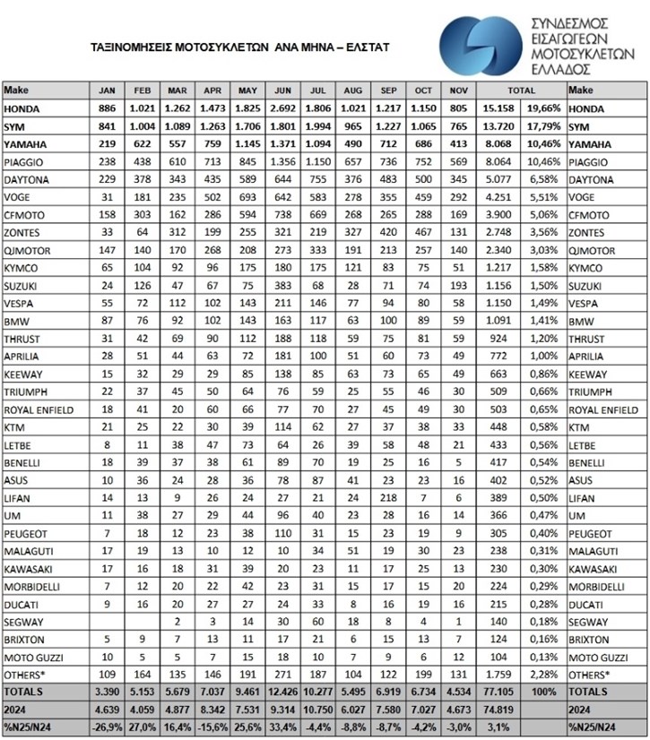 Οι συνολικές πωλήσεις για τους ένδεκα μήνες (Ιανουάριος - Νοέμβριος 2025) που συνολικά έφθασαν τα 77.105 δίκυκλα παραμένουν με θετικό πρόσημο + 3% σε σύγκριση με το αντίστοιχο διάστημα του 2024.