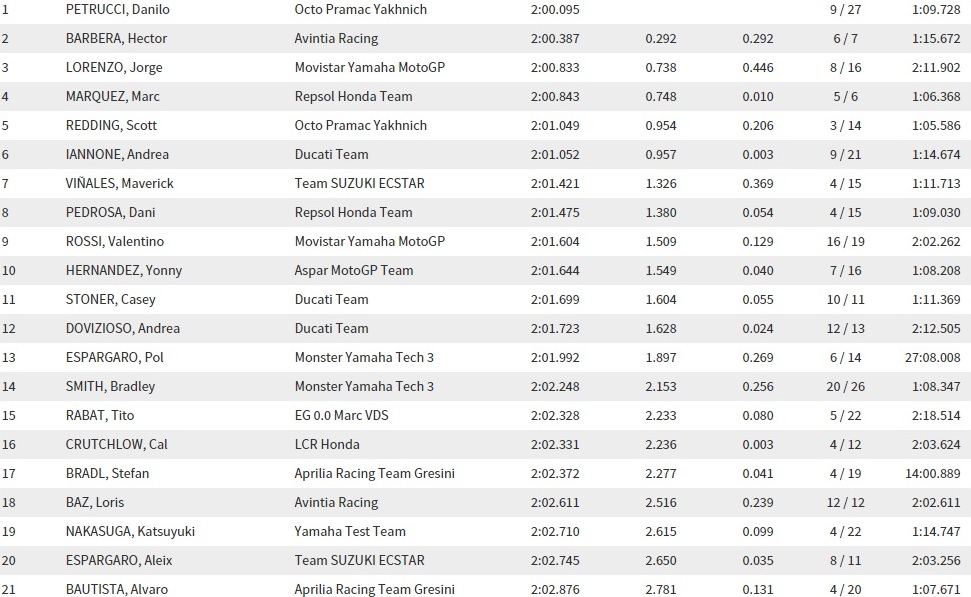 Ο Vale έχει κατεβάσει ένα δέκατο το χρόνο του, ενώ ο Casey Stoner έχει από πίσω του τους Dovizioso, Pol Espargaro, Bradley Smith και Cal Crutchlow.