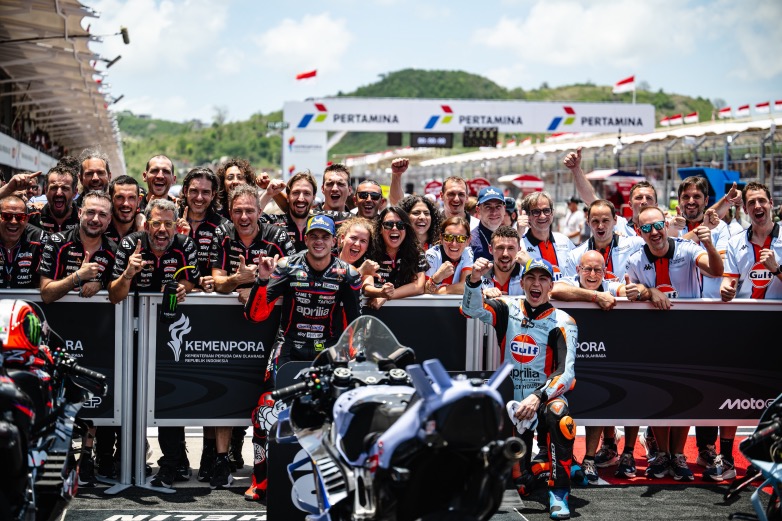 Ένα εξαιρετικό Σάββατο για την Aprilia Racing στην πίστα Pertamina Mandalika International Circuit. Ο Marco Bezzecchi πραγματοποίησε μια αψεγάδιαστη εμφάνιση, κυριαρχώντας σε κάθε σκέλος του Σαββάτου. Ήταν ταχύτερος στις ΕΔ2 και στη συνέχεια κατέκτησε την pole position με νέο απόλυτο ρεκόρ πίστας: 1:28.832. Κανείς δεν είχε κινηθεί ποτέ τόσο γρήγορα στην Mandalika. Αυτή ήταν η τρίτη pole position της σεζόν για τον Ιταλό αναβάτη, μετά από εκείνες στην Αυστρία και στο Misano. Για την Aprilia Racing, ήταν η πρώτη pole στην πίστα της Ινδονησίας και η δωδέκατη στην ιστορία της στην κορυφαία κατηγορία. Στον Αγώνα Sprint, παρά την όχι και τόσο ιδανική εκκίνηση που τον έριξε στην 6η θέση στο τέλος του πρώτου γύρου, ο Bezzecchi έκανε μια εντυπωσιακή αντεπίθεση, εξασφαλίζοντας τη νίκη με ένα καθοριστικό προσπέρασμα στον τελευταίο γύρο – τη δεύτερη νίκη του σε Sprint μετά το Misano.