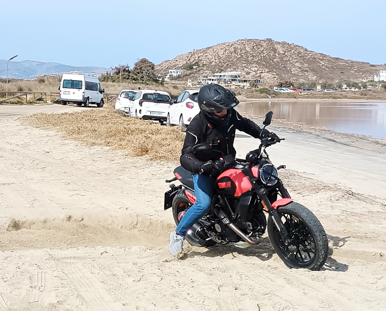 Κάποια στιγμή θα χρειαστεί να περάσεις από χωματόδρομο και στη Νάξο έχει πολλούς. Το χαμηλό ύψος και οι μαλακές αναρτήσεις σε συνάρτηση με τα «τακουνάτα» Pirelli μετατρέπουν σε παιχνίδι την ελαφριά Ducati και σύντομα κάνεις τον «Καϊρόλι».