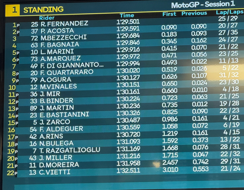 Ντεμπούτο στο MotoGP και για τον Diogo Moreira με την Honda LCR, με δύο δευτερόλεπτα διαφορά από την πρώτη Honda. O Celestino Vieti επιστρατεύτηκε για να αντικαταστήσει τον τραυματία της Κυριακής Franky Morbidelli και είναι αρκετά πιο αργός.
