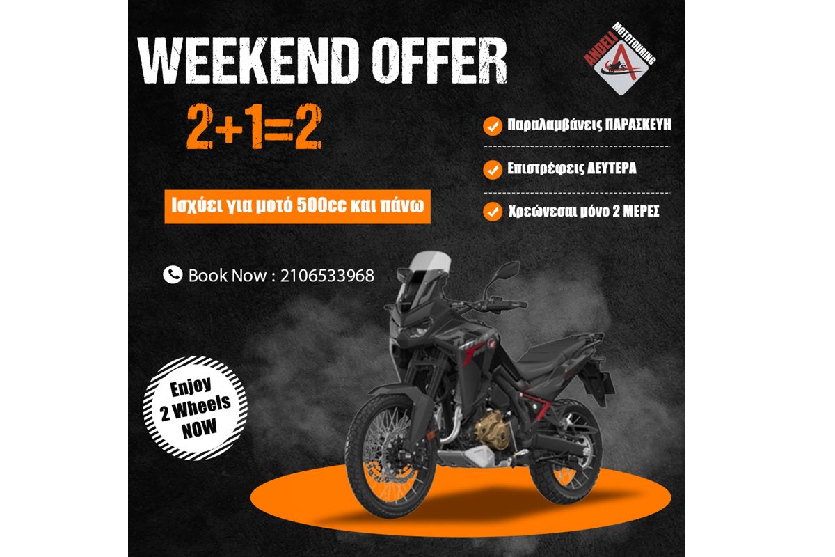 Τα Σαββατοκύριακα αποκτούν νέο ενδιαφέρον μέσα από την τελευταία προσφορά της Andeli, καθόσον μπορείτε πλέον να νοικιάσετε μία μοτοσυκλέτα ή mega scooter της Honda από Παρασκευή μέχρι Δευτέρα και να πληρώσετε τις δύο ημέρες από τις συνολικά τρεις!