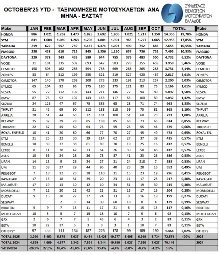 Οι συνολικές πωλήσεις για τους δέκα μήνες (Ιανουάριος - Οκτώβριος 2025) που συνολικά έφθασαν τα 72.571 δίκυκλα παραμένουν με θετικό πρόσημο + 3,5% σε σύγκριση με το αντίστοιχο διάστημα του 2024.