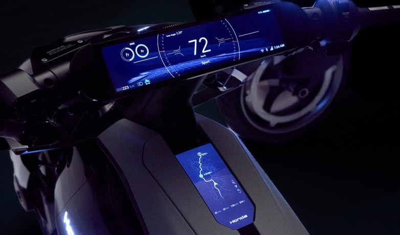 «Ο πίνακας οργάνων διαθέτει λεπτή και φαρδιά διάταξη, προσφέροντας ευρύ οπτικό πεδίο, ενώ οι καθρέφτες με κάμερες ενισχύουν την καθαρή και φουτουριστική αισθητική. Το GUI έχει σχεδιαστεί ώστε να προβάλλει διαισθητικά βασικές πληροφορίες, όπως η γωνία κλίσης της μοτοσυκλέτας, ενισχύοντας τη σύνδεση αναβάτη και μηχανής. Με τη μείωση των μη απαραίτητων πληροφοριών και ένα εύχρηστο σύστημα ελέγχου, ενισχύεται η αίσθηση εμβύθισης και η ομαλή,