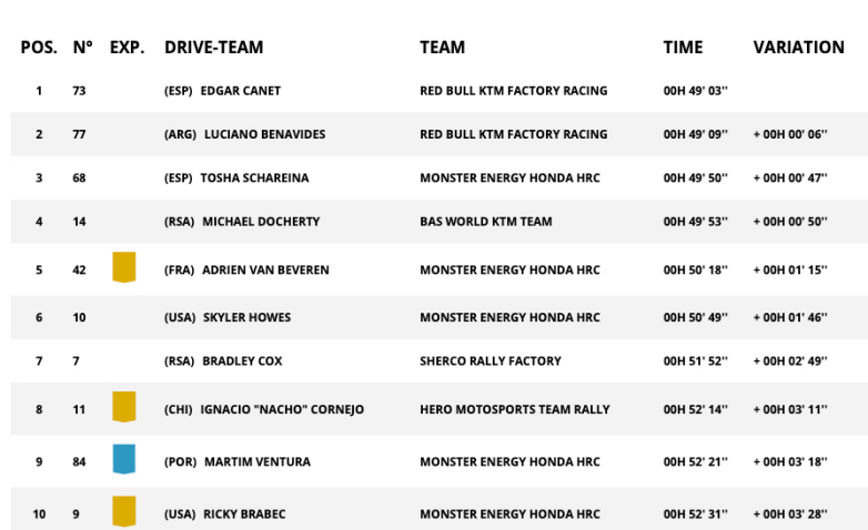 Στη Γενική Κατάταξη όλων των μοτοσυκλετών είναι στην 50η θέση, που είναι ο καλύτερός του τερματισμός στην 4η συμμετοχή του στο Dakar Rally!, που συνοδεύτηκε με ένα 4ο τερματισμό!