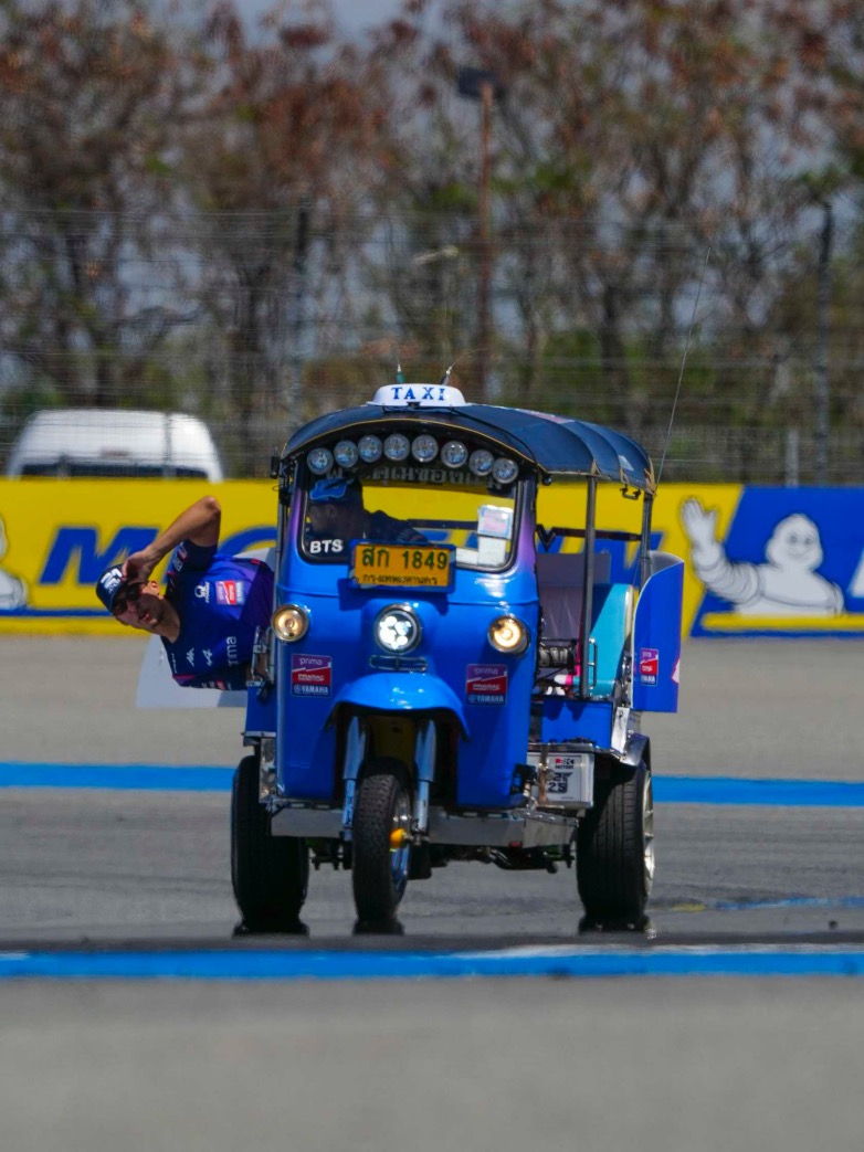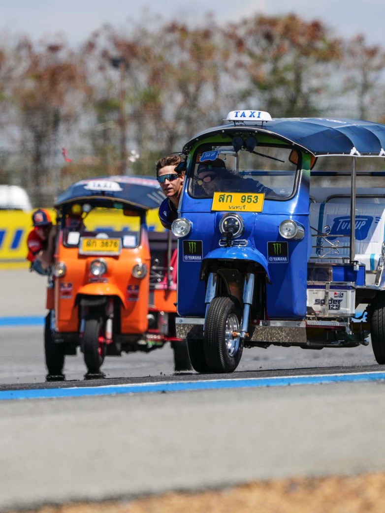 Καθώς η Κυριακή του Grand Prix ξεκινούσε, η παρέλαση των αναβατών στο GP της Ταϊλάνδης απέκτησε νέα όψη με τοπικό χρώμα: την πρόκληση Tuk-Tuk.