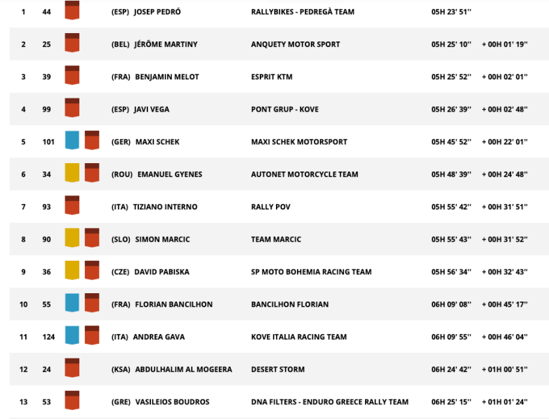 Στην κατηγορία Original by Motul, στην οποία διαγωνίζεται ο Έλληνας οδηγός κέρδισε ο Ισπανός Josep Pedro με Husqvarna, που ανέβηκε στην 2η θέση της Γενικής κατάταξης της κατηγορίας, τη στιγμή που στην πρώτη θέση πέρασε ο Γάλλος Benjamin Melot με ΚΤΜ.