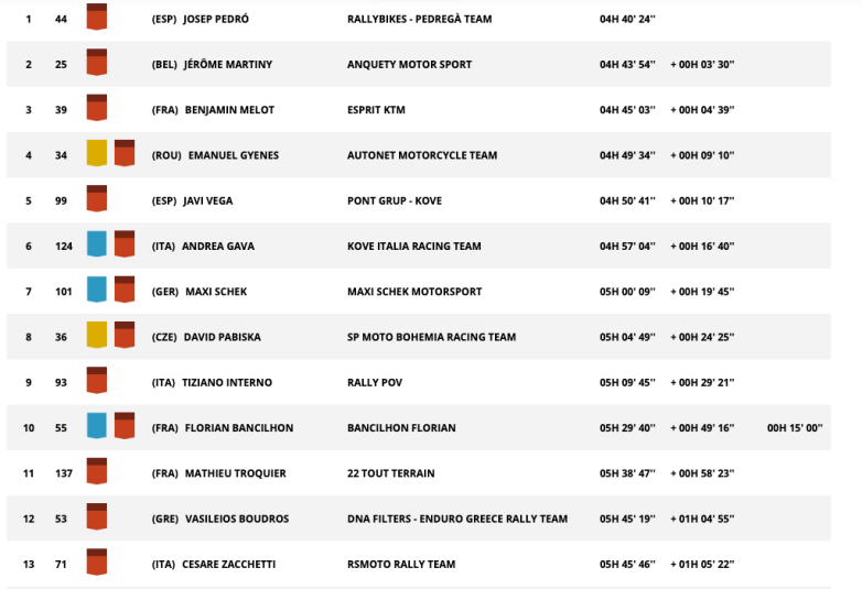 Στην κατηγορία Original by Motul, στην οποία διαγωνίζεται ο Έλληνας οδηγός κέρδισε πάλι ο Ισπανός Josep Pedro με Husqvarna, που παρέμεινε στην 2η θέση της Γενικής κατάταξης της κατηγορίας, τη στιγμή που στην πρώτη θέση από χθες πέρασε ο Γάλλος Benjamin Melot με ΚΤΜ. Η διαφορά τους είναι μόλις 1'27''.