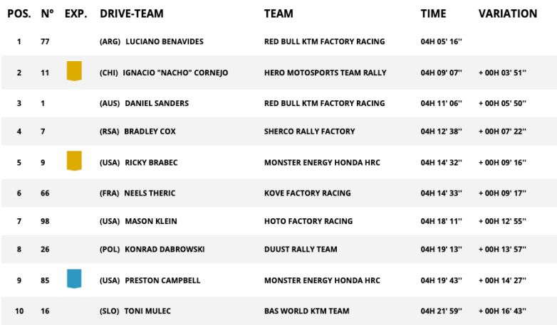Η Ειδική αυτή έδωσε επίσης την ευκαιρία σε δύο ακόμη αναβάτες να πραγματοποιήσουν τις καλύτερες εμφανίσεις τους μέσα στη σεζόν. Ο Χιλιανός Nacho Cornejo κατέκτησε τη δεύτερη θέση με την Hero, μόλις 3’51’’ πίσω από τον Benavides, ενώ ο Νοτιο-Αφρικανός Bradley Cox με την Sherco τερμάτισε τέταρτος, 7’22’’ πίσω από τον νικητή της ημέρας, ισοφαρίζοντας την καλύτερη επίδοσή του σε πέντε συμμετοχές στο Dakar (που είχε πετύχει στην 1η Ειδική του 2024).