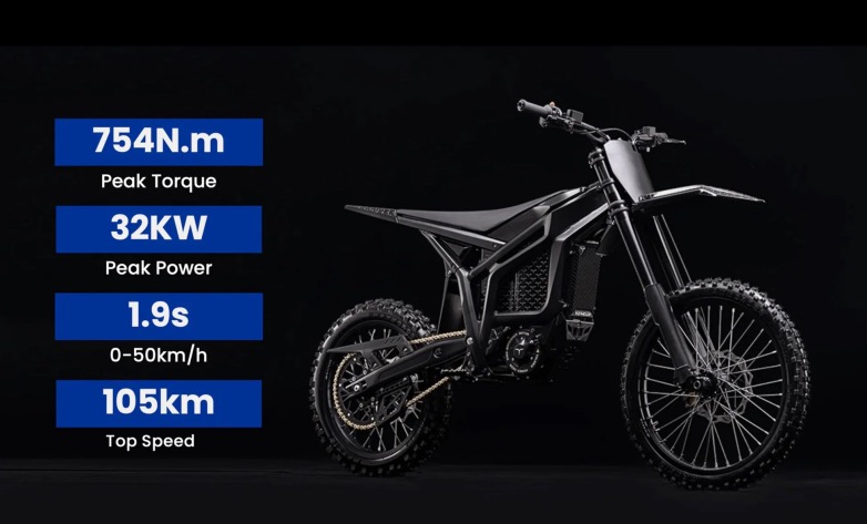 Κορυφαίος ηλεκτροκινητήρας ισχύος 32 kW (42 ίπποι), μέγιστη ροπή 754 Nm και μπαταρία 97,2 V 45 Ah, για ταχύτητες έως 105 χλμ./ώρα και αυξημένη αυτονομία (έως 115 χλμ. στα 45 χλμ./ώρα). Διαθέτει ξεκάθαρο off-road προσανατολισμό με τροχούς 21"/18", μπροστινό πιρούνι με διαδρομή 250 mm και ρυθμιζόμενες αναρτήσεις, καθώς και προγράμματα οδήγησης (Eco / Sport / Hyper / Reverse) και ανάκτηση ενέργειας στην πέδηση, όλα μέσα σε ένα ελαφρύ πλαίσιο βάρους μόλις 98 kg.