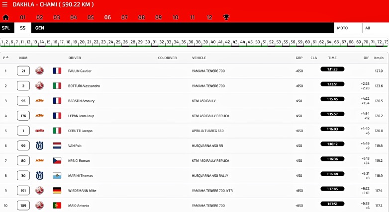 Ο πρώην αναβάτης MXGP Paulin, που συμμετέχει για πρώτη φορά στο AER στην κατηγορία μοτοσυκλετών, έχοντας κερδίσει την έκδοση του 2024 στην κατηγορία αυτοκινήτων, πραγματοποίησε μια εντυπωσιακή εμφάνιση και πήρε τη νίκη με το Ténéré 700 Rally σε χρόνο 1 ώρα, 11 λεπτά και 23 δευτερόλεπτα, χαρίζοντας στην ομάδα την τρίτη της νίκη σε 6 Ειδικές. Ο 35χρονος Γάλλος αναβάτης βρίσκεται πλέον 5ος στη γενική κατάταξη, μόλις 7 λεπτά και 1 δευτερόλεπτο πίσω από τον πρωτοπόρο, με το ράλι να εξελίσσεται σε μια στενή μάχη 5 αναβατών για τη νίκη.