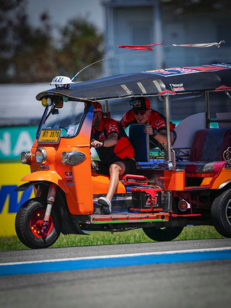 Καθώς η Κυριακή του Grand Prix ξεκινούσε, η παρέλαση των αναβατών στο GP της Ταϊλάνδης απέκτησε νέα όψη με τοπικό χρώμα: την πρόκληση Tuk-Tuk.