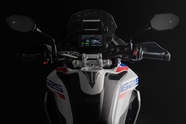 Τα προστατευτικά κάγκελα, οι προστατευτικές χούφτες και η ποδιά αλουμινίου συμπληρώνουν τον adventure εξοπλισμό, ενισχύοντας την πρακτικότητα και την προστασία σε μικτή χρήση της 625X PRO.