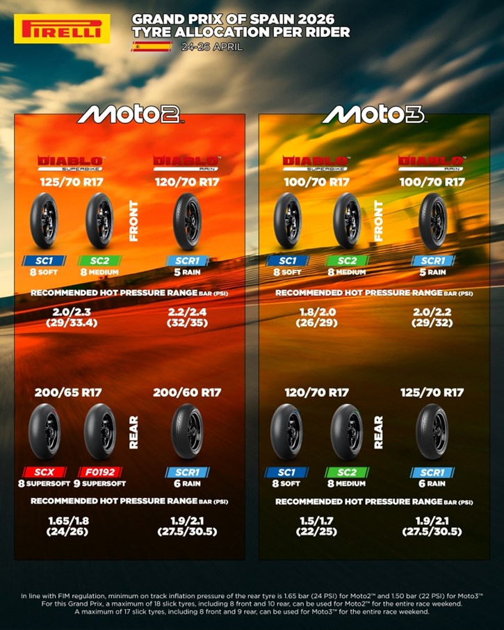 - Αξιοπιστία για την Moto3™. Η κατηγορία εισόδου του Παγκοσμίου Πρωταθλήματος θα βασίζεται σε γνωστές και δοκιμασμένες λύσεις: τη μαλακή SC1 και τη μεσαία SC2 για μπροστά και πίσω. Πέρυσι, ο José Antonio Rueda κέρδισε τον αγώνα χρησιμοποιώντας τη μεσαία SC2 μπροστά και τη μαλακή SC1 πίσω.