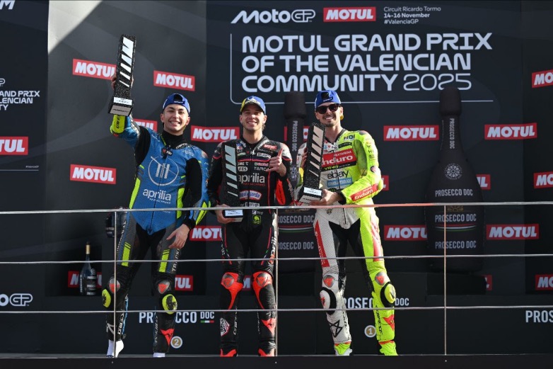 Δύο συνεχόμενες νίκες για πρώτη φορά και ένα πρώτο 1-2 από το 2023; Αυτό είναι ένα ιδανικό φινάλε για την Aprilia, καθώς ο Marco Bezzecchi (Aprilia Racing) εξασφαλίζει μια νίκη από την εκκίνηση μέχρι τον τερματισμό στην Valencia. Ο Ιταλός όμως έπρεπε να δουλέψει σκληρά. Ο Raul Fernandez (Trackhouse MotoGP Team) έκανε μια εξαιρετική εμφάνιση για να ολοκληρώσει το εντός έδρας GP για τον ίδιο μόλις 0.6s πίσω από τον Bezzecchi, ενώ ο Fabio Di Giannantonio (Pertamina Enduro VR46 Racing Team) πέρασε τον Pedro Acosta (Red Bull KTM Factory Racing) για να εξασφαλίσει την 3η θέση και να διατηρήσει το σερί των 88 συνεχόμενων βάθρων για την Ducati ενόψει 2026.