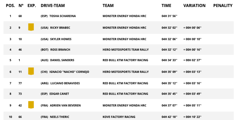 Επίσης από τις ΗΠΑ ο Skyler Howes, μόλις 10 δευτερόλεπτα πιο πίσω, διαμόρφωσε το 1-2-3 για την Honda, υπογραμμίζοντας τη δύναμη του Ιάπωνα κατασκευαστή. Στον αντίποδα, ο συναθλητής τους Adrien Van Beveren έχασε ακόμη 5 λεπτά και πλέον βρίσκεται στο όριο της πρώτης δεκάδας, με συνολική διαφορά 27’24’’ από τον Schareina.