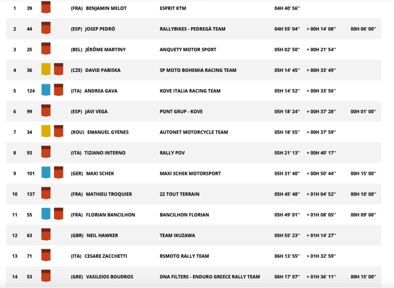 Στην κατηγορία Original by Motul, στην οποία διαγωνίζεται ο Βασίλης Μπούδρος, ο Γάλλος Benjamin Melot με ΚΤΜ ξαναπήρε την πρώτη θέση στη Γενική Κατάταξη της κατηγορίας και μάλιστα με διαφορά σχεδόν 14' λετπά από τον Josep Pedro με Husqvarna, μετά και την ποινή 7' λεπτών που επιβλήθηκε στον Ισπανό.