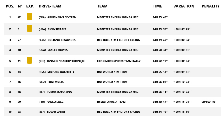 Η νίκη της Ειδικής πήγε στον Γάλλο Adrien Van Beveren, ο οποίος από την εκκίνηση στο Yanbu ζει ένα πραγματικό «τρενάκι του τρόμου». Φέτος έσπασε επιτέλους το ρόδι στον δρόμο προς την Bisha, κατακτώντας την Ειδική την ημέρα που το bivouac τίμησε τον αείμνηστο Thierry Sabine, τον άνθρωπο που δημιούργησε το Paris–Dakar και το Enduro du Touquet, τον αγώνα όπου ο Van Beveren έκανε γνωστό το όνομά του με τρεις νίκες (2014 έως 2016). Η έβδομη νίκη Ειδικής στην καριέρα του στο Dakar ανέβασε τον αναβάτη από τη βόρεια Γαλλία μία θέση ψηλότερα στην ιεραρχία, φέρνοντάς τον πλέον στην έκτη θέση της γενικής κατάταξης, περίπου μία ώρα πίσω από τον Αμερικανό πρωτοπόρο.